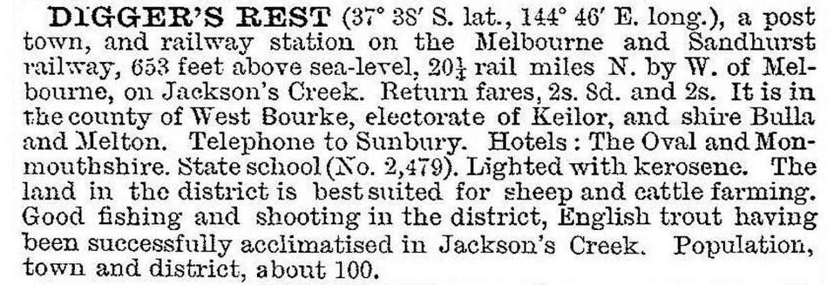 A railway station was opened on the line from Melbourne to Sunbury (1859). A primary school was opened in 1874, and Diggers Rest became a postal village with a general store, post office, weighbridge, mechanics' institute and a chaff mill. Diggers Rest was described in the 1903 Australian handbook: