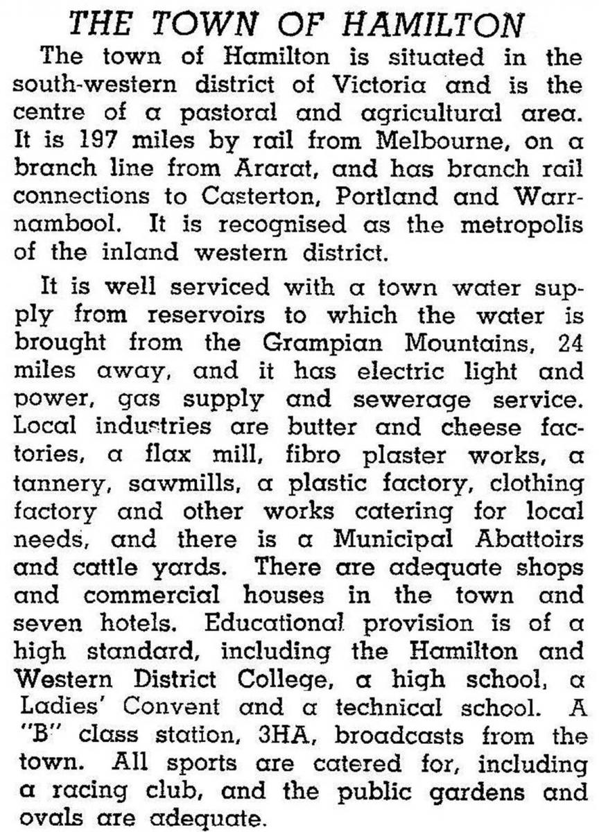 Mainly dependent on the grazing industry, saleyards and an abattoir are obvious commercial enterprises, but a timber mill and machine tool firm made some variety to the town’s enterprises. The water supply is piped to local reservoirs from the south-western ranges of the Grampians. Regional agricultural development was boosted by various nineteenth century selection Acts, closer settlement and soldier settlement schemes following World Wars I and II, and the gradual break up of major squatting runs. Diversifications have included dairying, flax growing, grain crops – principally barley and oats – and more recently ultra fine wool and an emerging silviculture industry. However the town also was the base from which Reginald M. Ansett began to build his transport empire in 1931, first operating a road service to Ballarat, and in 1936, his air service from Hamilton to Melbourne.