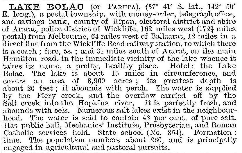 When surveyed the township was named Parupa, but local usage caused the name change by the 1870s. A shanty was built near Lake Bolac in 1856, six years before township blocks were sold. Their sale coincided with the construction of a bluestone hotel, part of which has continued in use. A bluestone general store, Veale’s, was built in 1868. Within a decade or so there was a school (1866), a Catholic church (1872) and a Presbyterian church (1878).