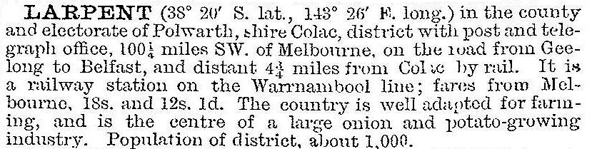 Most farms were less than 8 hectares, and most farmers were Presbyterian. A school was conducted in a Presbyterian chapel during 1859-74. The land was suitable for vegetable growing, grazing and cropping. In 1903 Larpent was described in the Australian handbook: