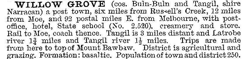 Settlers also used the track from the mid-1860s selecting land along the Latrobe River and clearing the open forest. Farm produce was supplied to miners at Tangil and Walhalla and to railway camps at Moe. An eating house was at the junction with the Melbourne road, south of the Latrobe River. In 1883 La Trove River School commenced, north of the river. In 1889, north of the school, an old wine shanty was converted into a post office and the district was officially recognised as Willow Grove. The name is thought to be descriptive of the wild acacia that grew in the area which was known as ‘wild willow’ or ‘willow scrub’.